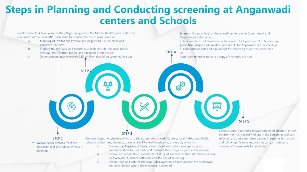 Defects at Birth, Deficiencies, Diseases specific to childhood and Developmental delays including disabilities, “4Ds”, can either lead to untimely death of a child or a survival with poor developmental outcomes. Such long lasting adverse health outcomes can be addressed only through early screening and timely intervention and management. Extending preventive and promotive health as an approach for selected health conditions along with provision of free curative management, will help the marginalized and underprivileged population by reducing their out of pocket expenditure thereby influencing public health expenditure. This, in the long run, will improve the quality of our National human resource pool. Keeping this in view, the Ministry of Health and Family Welfare, introduced “Child Health Screening and Early Intervention Services” as Rashtriya Bal Swasthya Karyakram (RBSK) under the National Health Mission. The services under RBSK are to cover all the thirty selected health conditions through their screening, early detection & free management, for children from birth to 18 years of age.