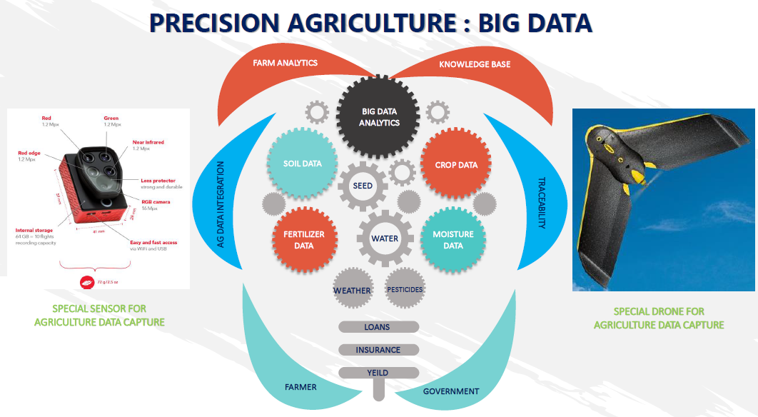 Aegis Consulting has partnered with experts in USA and Europe in promoting Precision Farming or Precision Agriculture solutions to India. Precision Agriculture is generally defined as information technology based farm management system to identify, analyse and manage special and temporal variability within fields for optimum productivity, sustainability and profitability. This also helps in protection of land resource by minimizing the production costs, increasing environmental consciousness of the farmers and public. These agriculture management practices help’s in conservation of natural resources like water, air, soil and soil quality while staying economically profitable. It also carefully manages the use of inputs like chemical fertilizer and pesticides based on right quantity as needed for the crop and the soil. The productivity gain in global food supply have increasingly relied on expansion of irrigation schemes in the recent times. Global competition in agriculture products is challenging economic viability of the traditional agriculture systems and requires development of new and innovative systems. A synchronous, global shutter drone sensor with four bands and an RGB camera for the ultimate in multispectral accuracy